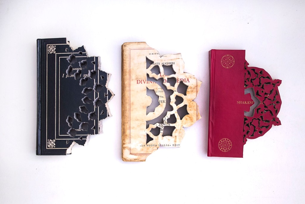 The series “Ante-Nati” consists of books cut and re-shaped using an ancient Iranian method of carving on wood named Monabbat Kari which traditionally was used to decorate wood and metal objects by hand cutting and inlaying them with floral and geometric patterns and elements. The books in question represent pillars of western literature; in fact the intention behind the piece is centered on the concept of culture used as literal raw material rather than an untouchable principle. The goal is to generate new cultural roots through the use and collection of a series of elements that come from different territories. The piece strives to bypass the barriers of traditional categories regarding western and eastern archetypes by creating a new idea of culture which no longer finds its roots in the past, but extends them to the present and eventual future. The title “Ante-Nati”, which means born forward, plays with this temporal concept: an element that although originally comes from the past, it has the capacity to draw and model the future. Phenomenons like globalization, mass immigration, the digital flow of information on a global scale, and the speed with which they grow have created a true need to rethink our classic categorization of Western/Eastern culture. This concept aims at changing the idea that cultural roots are planted, static, and depend on a specific territory but are progressive, dynamic, and are constantly closing the gaps between different cultures with the goal of creating a new symbolic shared domain.