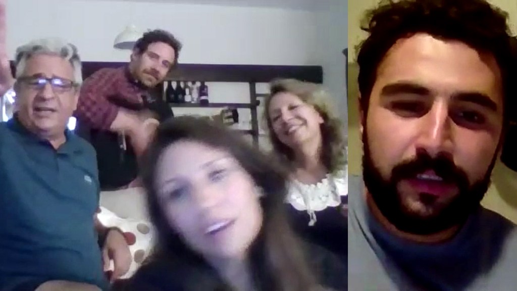 “It’s September 23, 2020, and the voice of Alireza Bagherzadeh resonates through the pixelated screen, singing the familiar tune ‘Bim bada bum bam,’ the opening of ‘Ashyaneh,’ a well-known Iranian folk song that has always accompanied special occasions in the Bagherzadeh household. It’s Andisheh’s father’s sixtieth birthday, but he is forced to join the celebrations from afar, awaiting the renewal of his residency permit, without which he is barred from traveling abroad in the few months of respite between waves of Covid. The artist captures this intimate moment where joy and sadness blend in the gazes of his family and in his own. Thus, a glimpse of personal life transforms into a collective reflection, for it’s not just the physical distance that weighs heavily, nor the choice of detachment from one’s origins, but also the awareness of missed opportunities and denied rights, caught in the grip of bureaucracy.”
